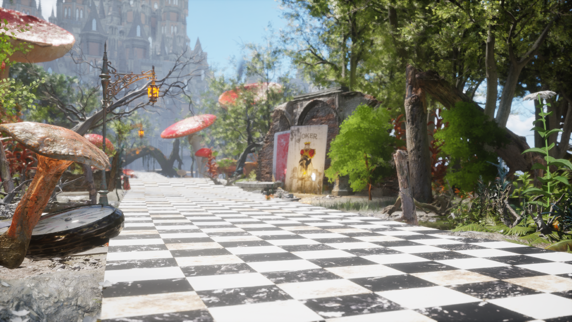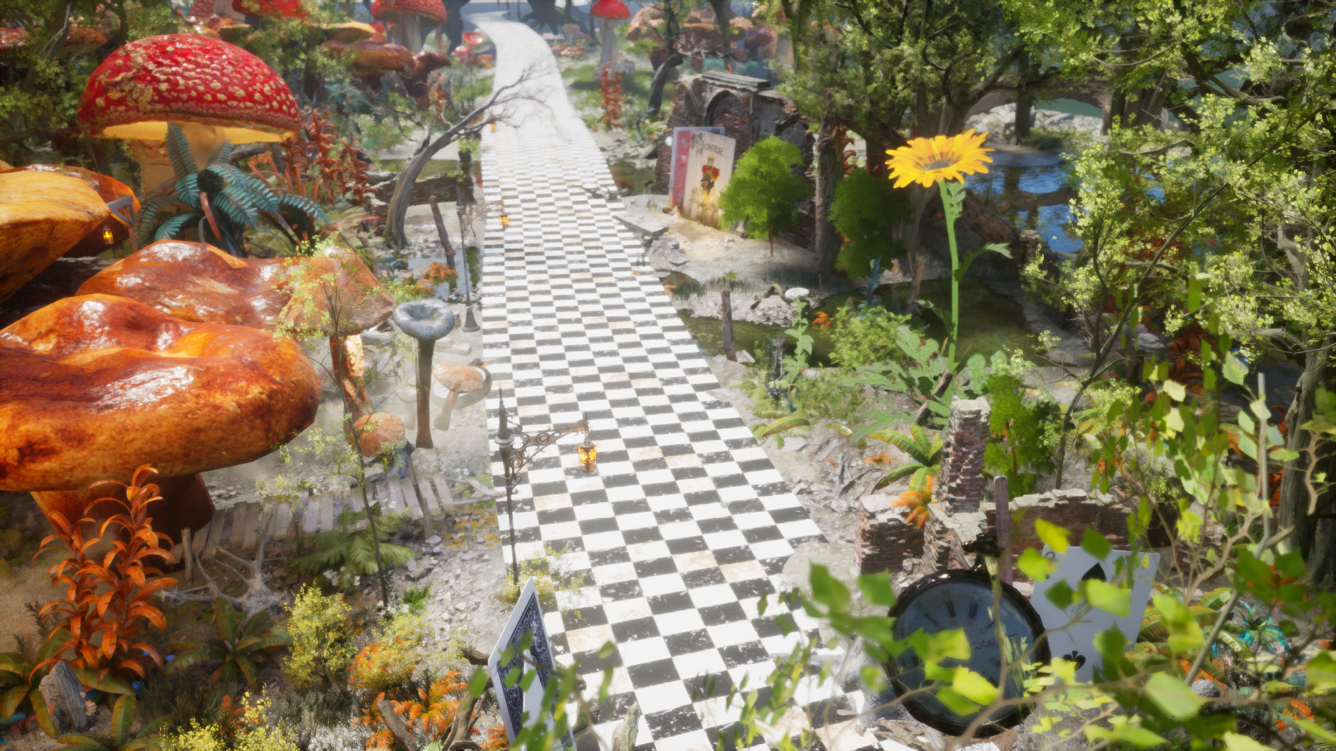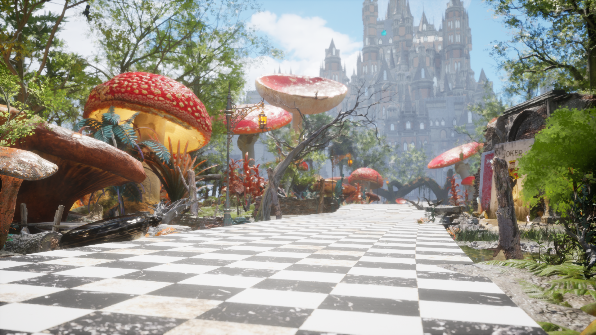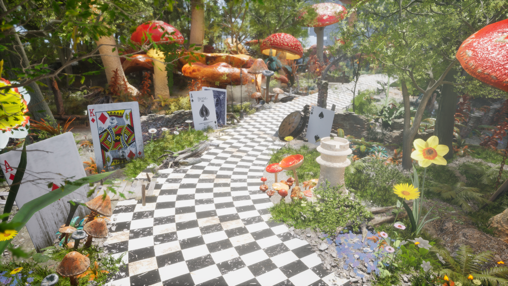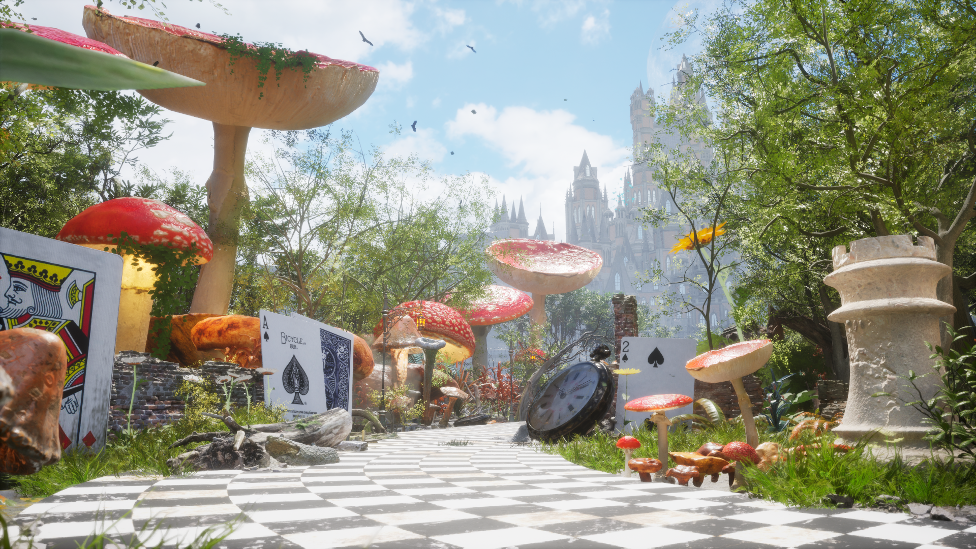비현실적인 크기의 버섯, 체스말, 트럼프 카드 등의 오브젝트가 등장하며