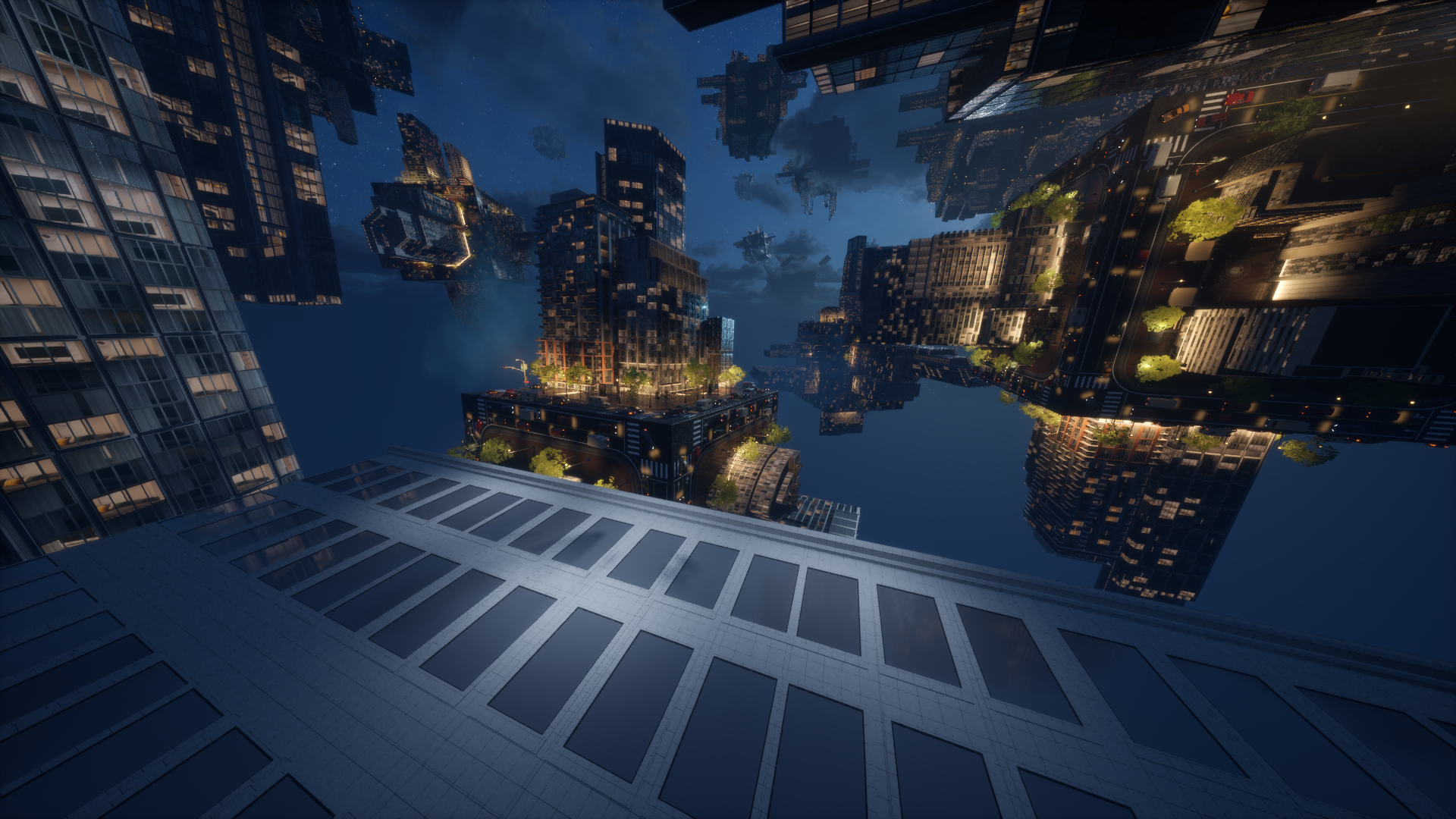 건물들이 중력의 방향을 잃은 채 하늘과 맞닿아 있으며,
