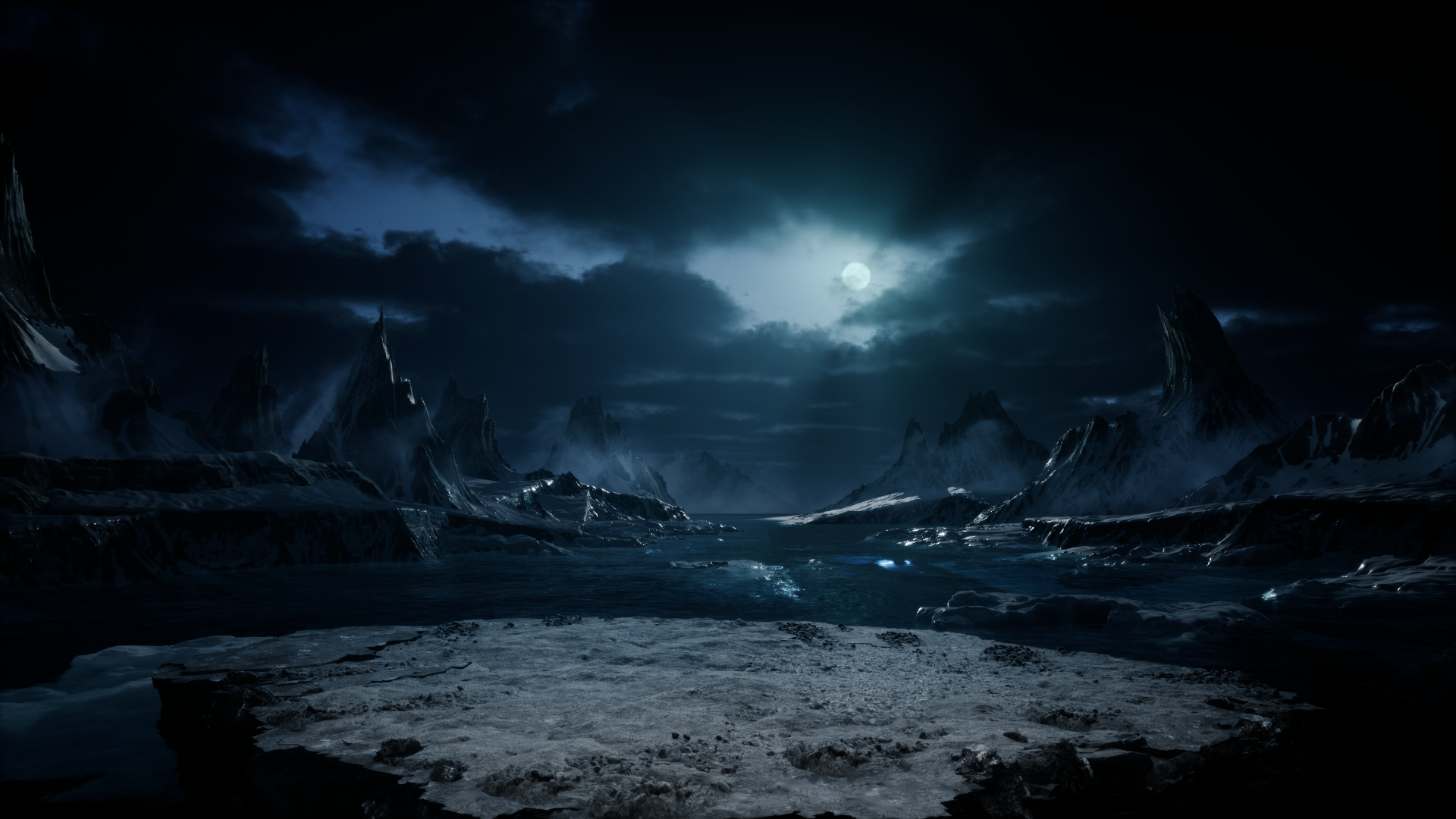 짙은 달빛이 얼어붙은 협곡을 비추며, 차가운 공기가 느릿하게 흐른다.