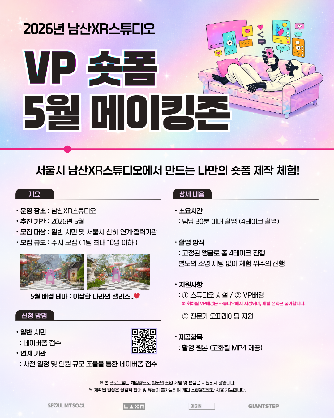 '시민 참여 체험 프로그램 [VP 숏폼 메이킹존]' 을 다음과 같이 운영하오니 많은 관심과 참여 바랍니다.