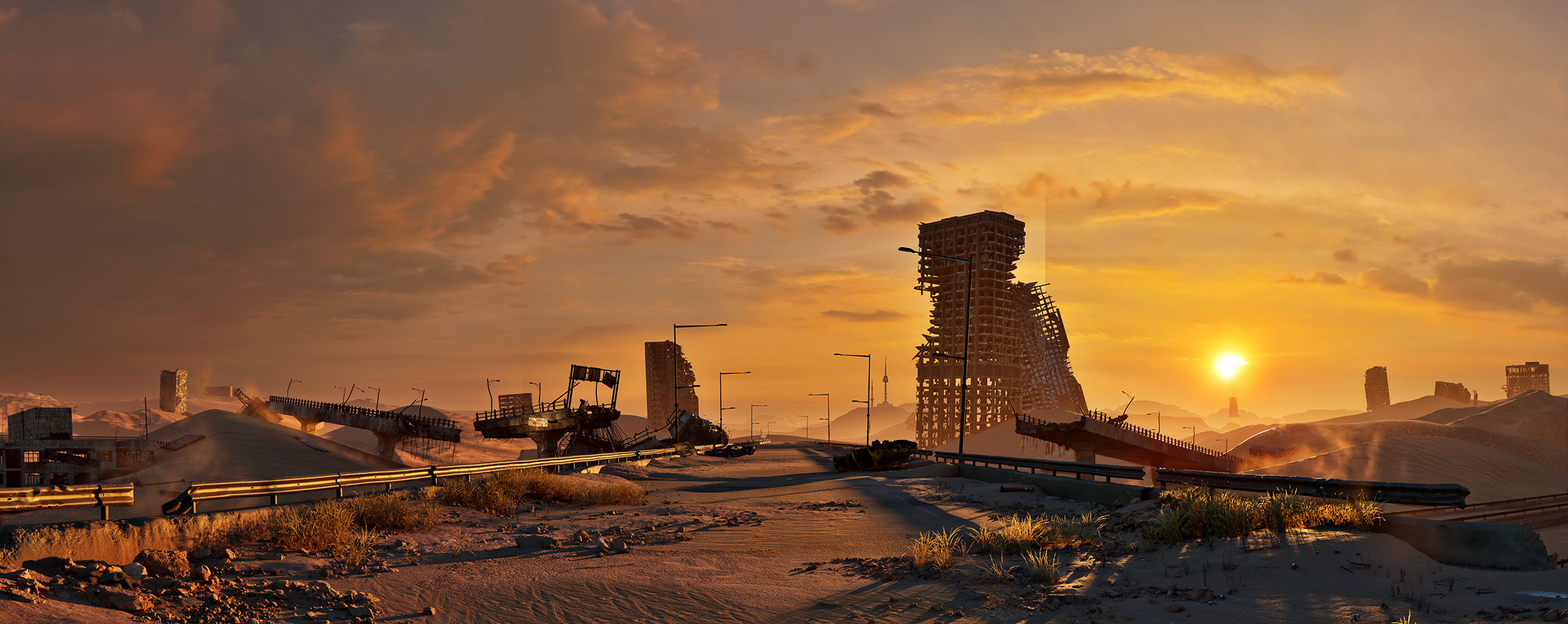 석양이 지는 붉은 하늘 아래, 붕괴된 고층 건물과 부서진 도로, 황량한 사막이 조화를 이루며 몰입감을 더한다.