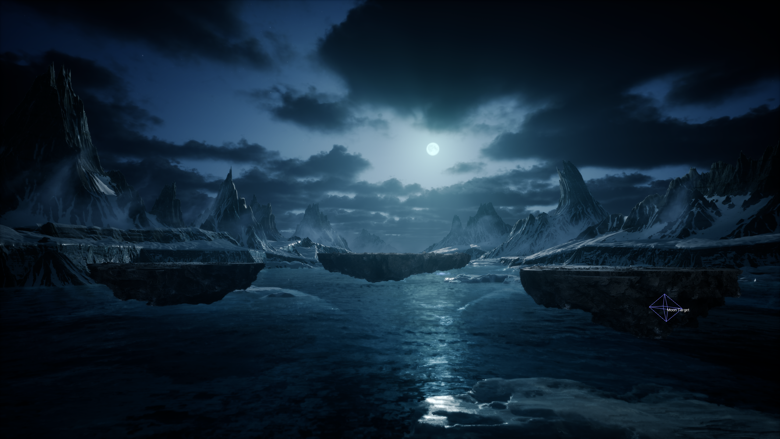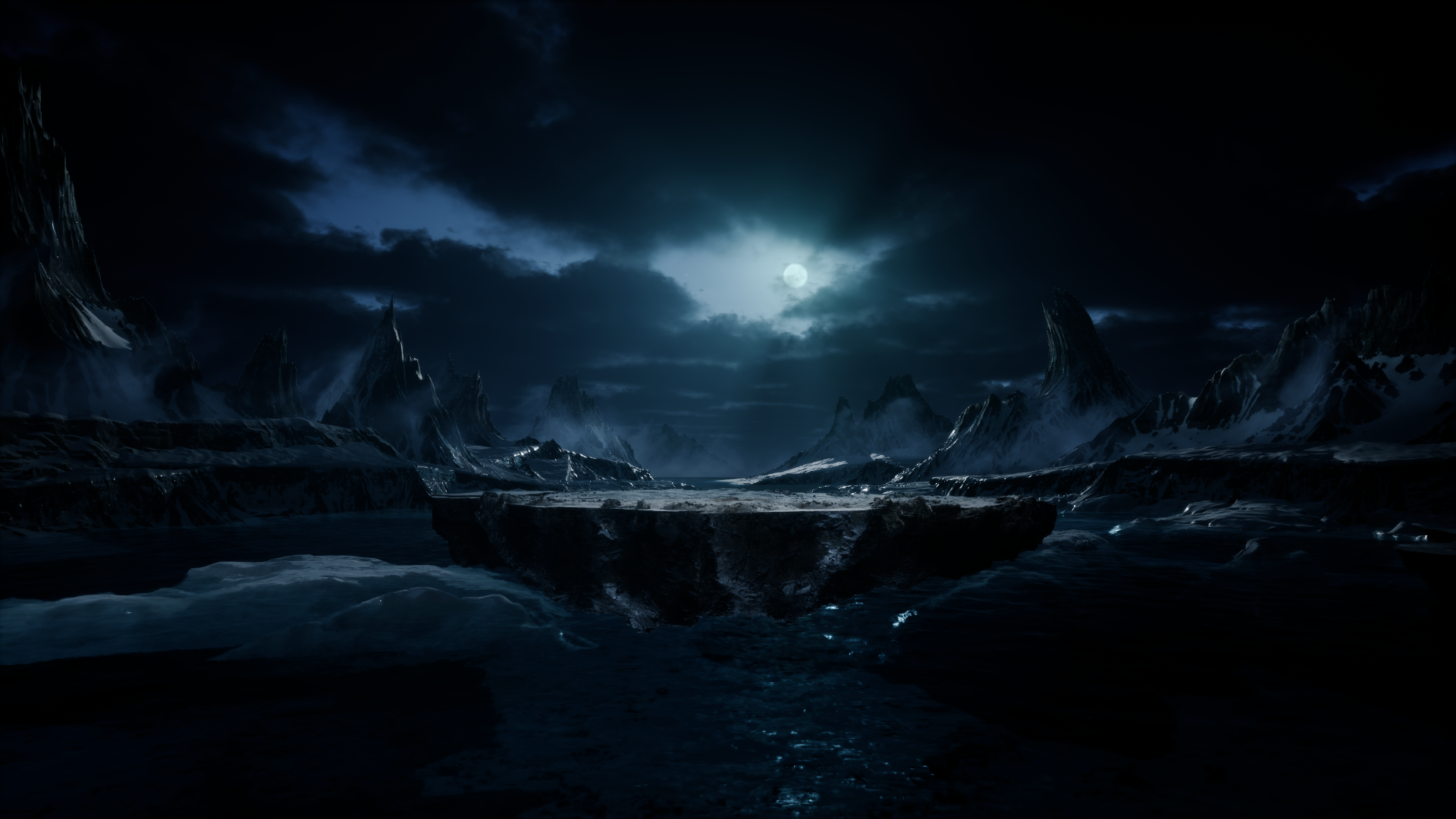 짙은 달빛이 얼어붙은 협곡을 비추며, 차가운 공기가 느릿하게 흐른다.