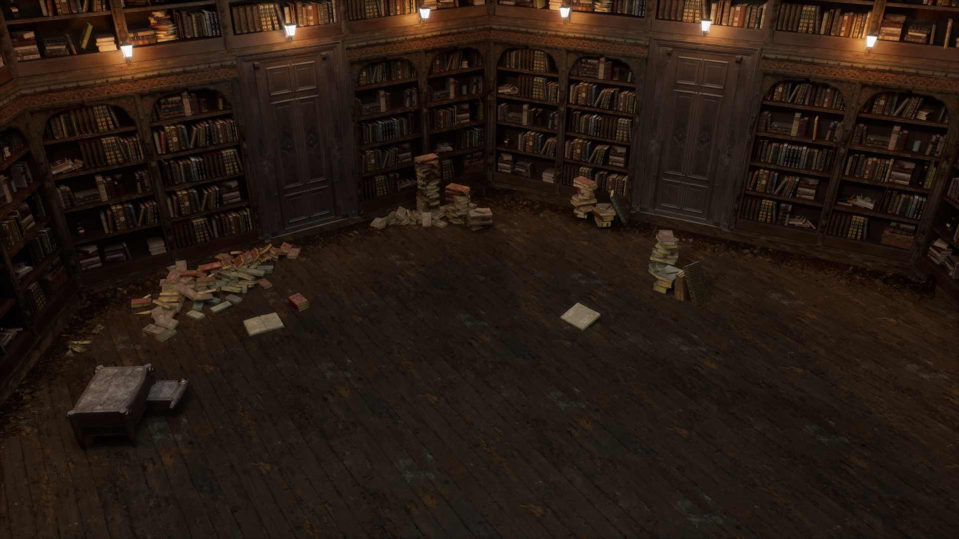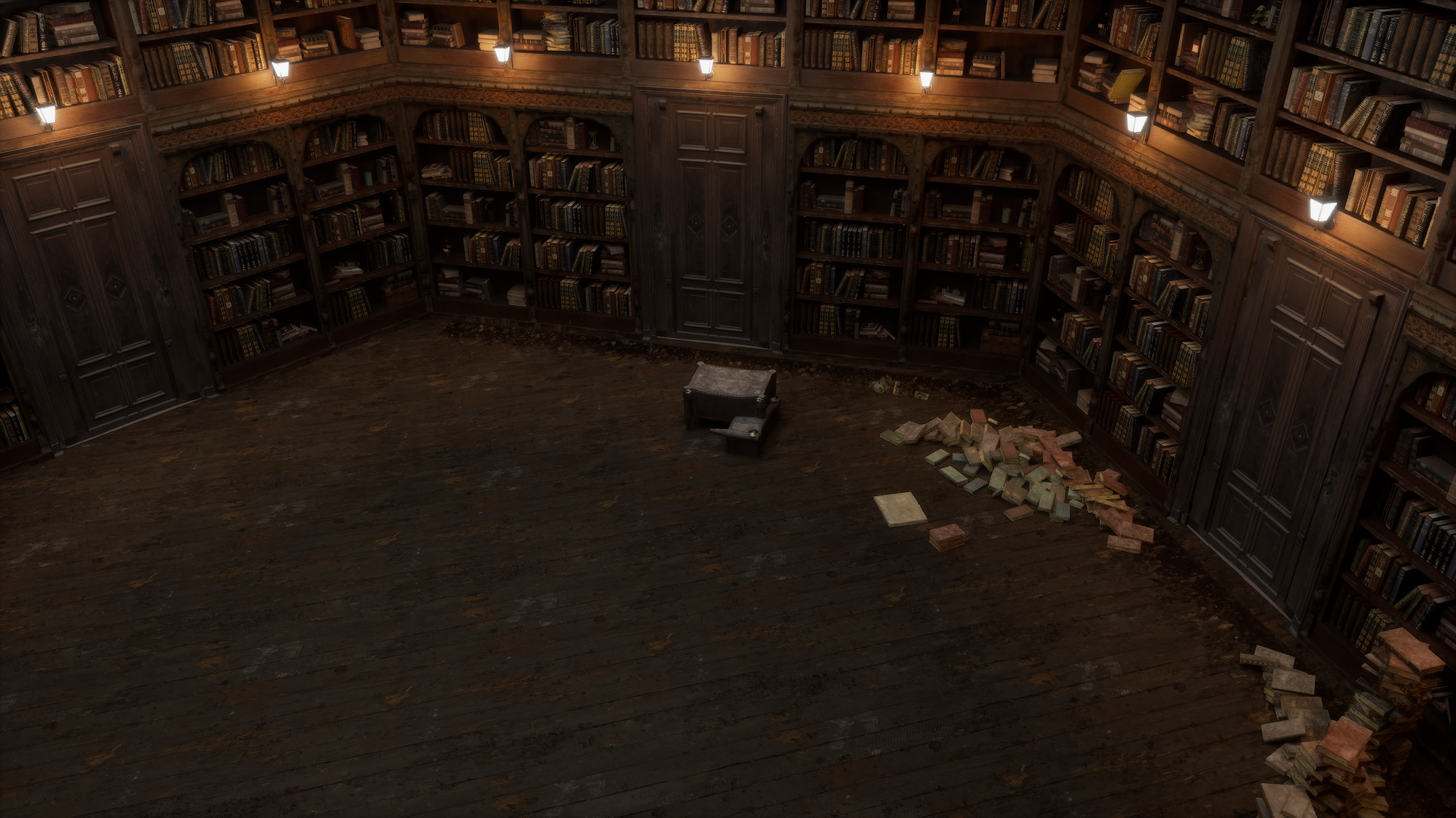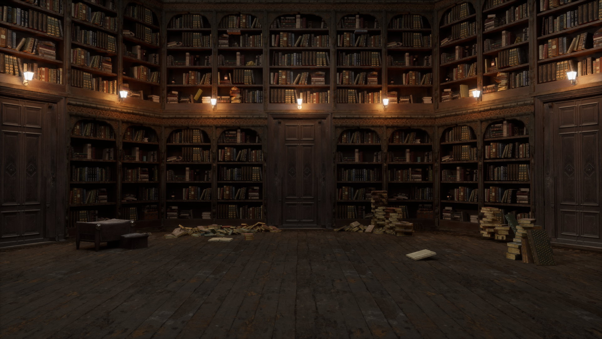 짙은 목재로 된 책장이 벽을 따라 둥글게 둘러서 있으며,